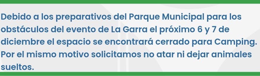 Con motivo de desarrollarse el evento "La Garra" los días 6 y 7 en el Parque, el mismo permanecerá inhabilitado desde este 2/12 para acampar, atar o dejar animales sueltos.