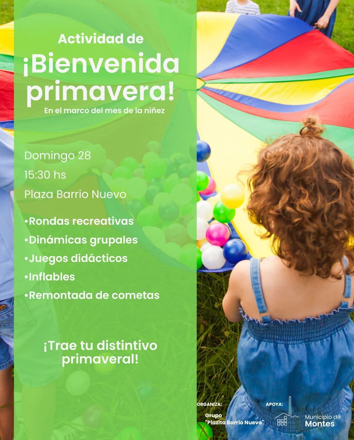 Actividad de Bienvenida Primavera Actividad de Bienvenida Primavera, cerrando el mes de la niñez. Lugar: Plaza Barrio Nuevo. Dia y Hora: Domingo 28/09 - 15:30hs. Galería de imágenes