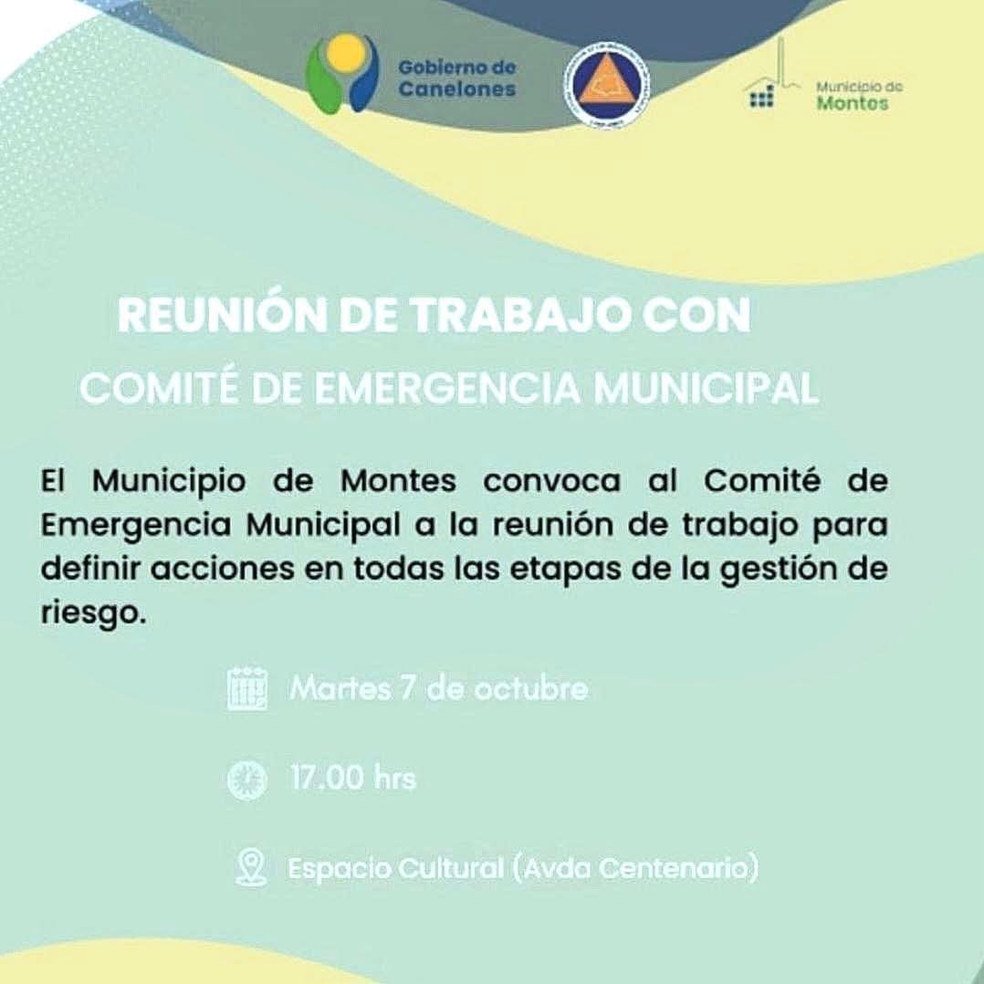 En el marco de los cometidos de los Municipios (ley de Descentralización Nº 18567) y atendiendo al funcionamiento del SINAE (Sistema Nacional de Emergencia ley Nº 18621) y la necesidad de contar con un Comité de Emergencia Municipal, es que les convocamos para una reunión de trabajo