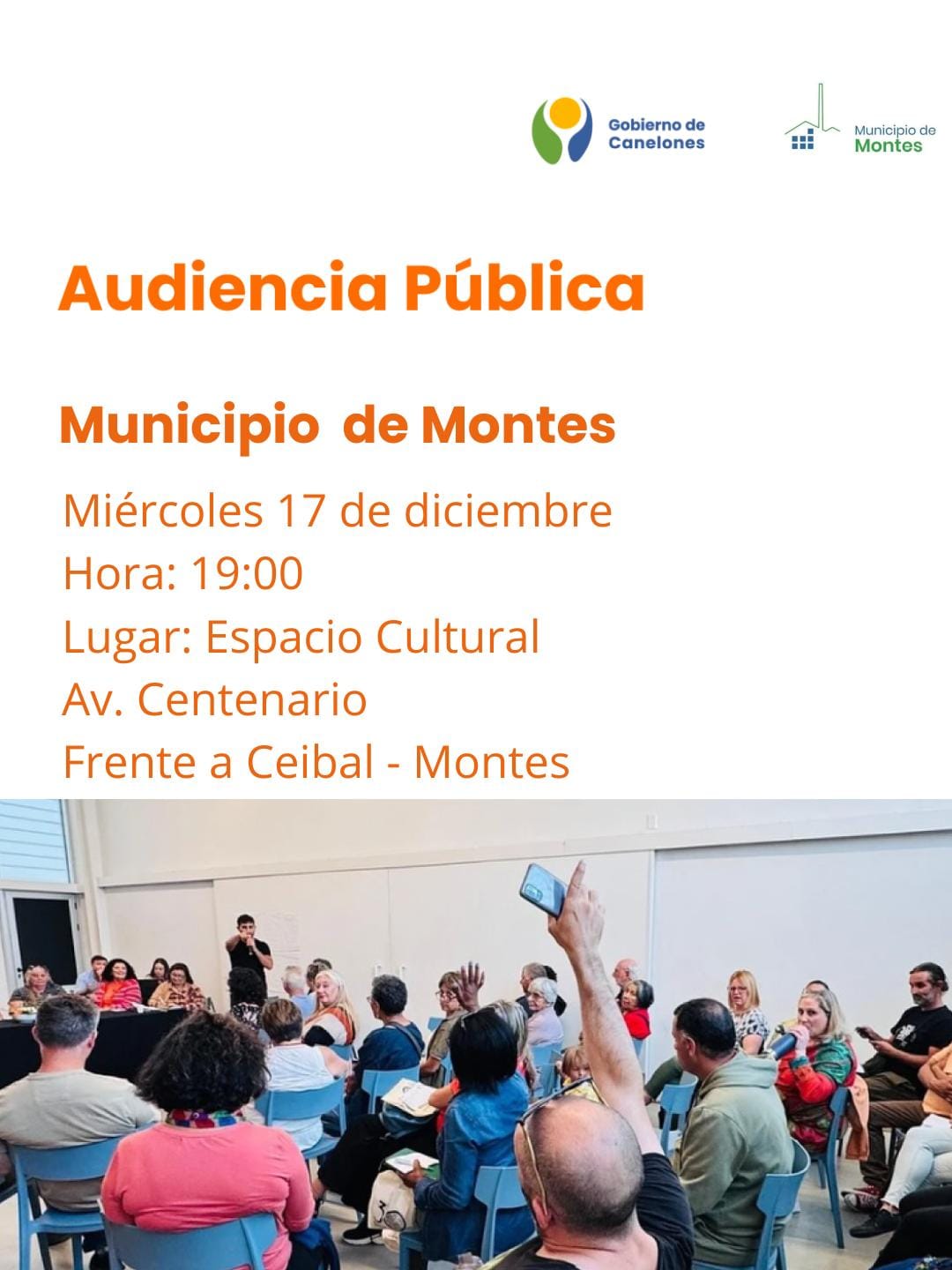 El Concejo del Municipio de Montes invita a la ciudadanía a participar de la Audiencia Pública a realizarse el miércoles 17 de diciembre a las 19:00 hs en el Espacio Cultural (Avda Centenario y Ceibal)