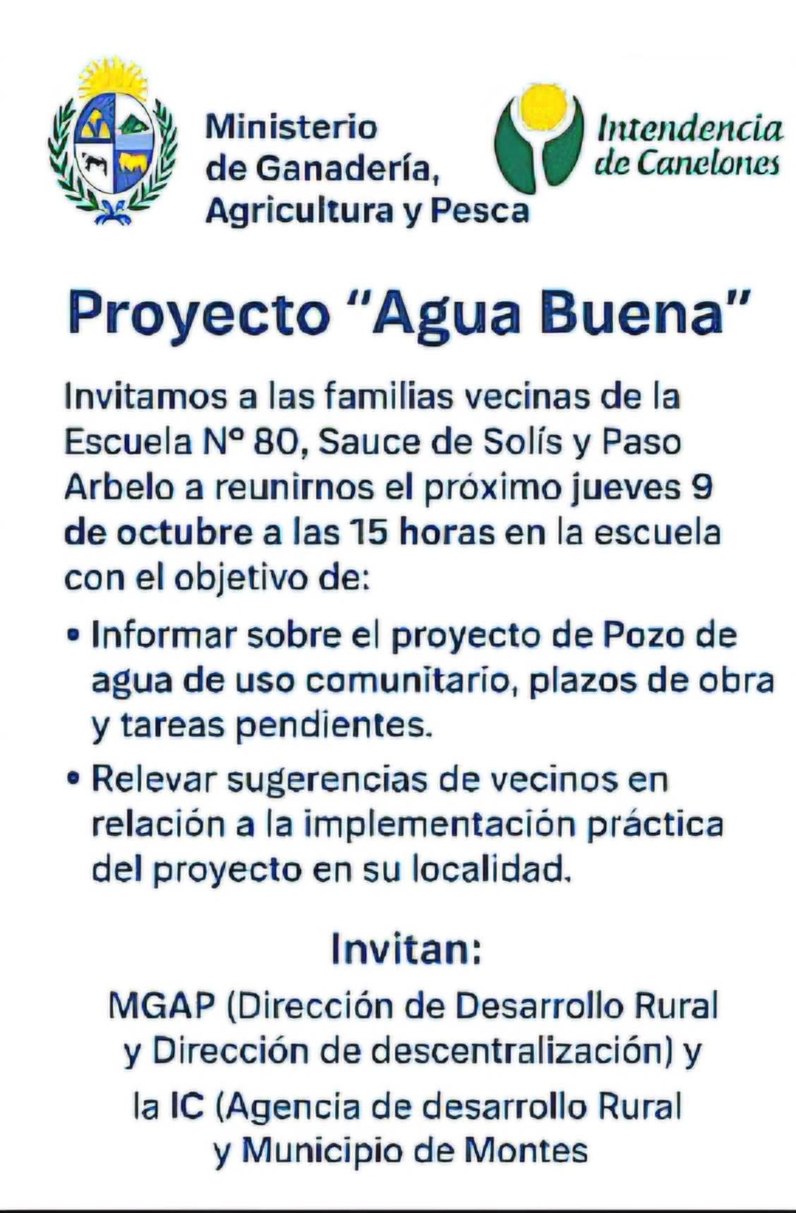 se invita a Familias vecinas de la ESCUELA N°80 (Sauce de Solis y Paso Arbelo) para una reunión respecto al Proyecto "AGUA BUENA" donde: